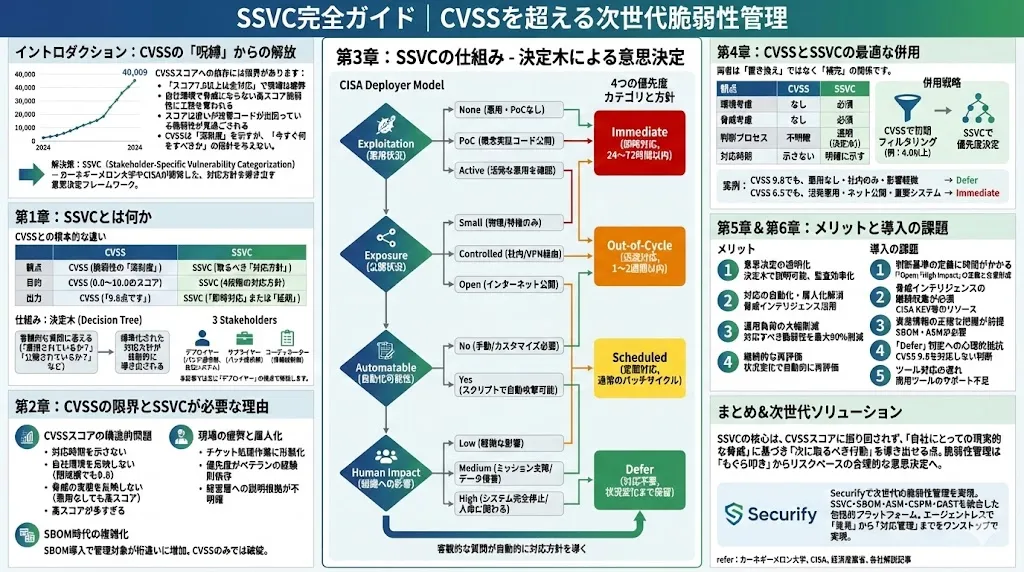 メタディスクリプション: SSVC(Stakeholder-Specific Vulnerability Categorization)の完全ガイド。CVSSの限界を超え、決定木で対応優先度を自動判定。SBOM、ASM、CSPMとの統合で実現する次世代脆弱性管理を解説。